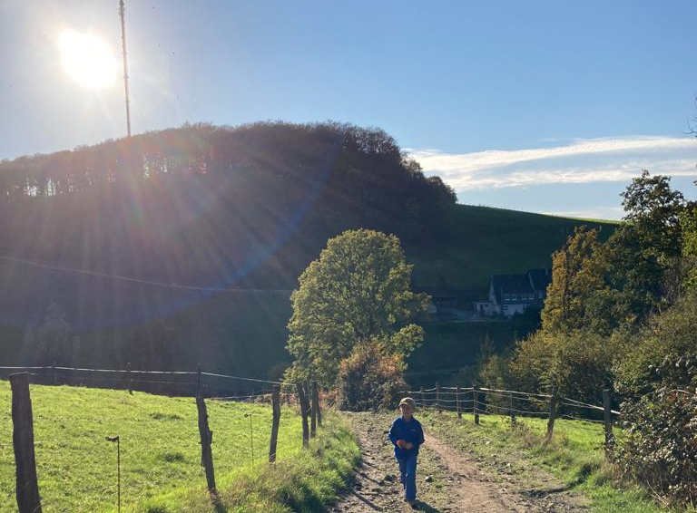 Der Gustav-Heinemann-Weg führt über insgesamt 7,1 Kilometer und je 130 Höhenmeter im An- und Abstieg rund um Velbert-Nierenhof. Der Parkplatz befindet sich unmittelbar am gleichnamigen S-Bahnhof. Die Übersichtskarte und der eigentliche Startpunkt befinden sich auf der gegenüberliegenden Straßenseite, auf der anderen Seite der Bahnschienen. Das fanden wir etwas verwirrend, zumal die Wanderung selber dann gleich wieder die Straße überquert. Wir haben uns etwas schwer damit getan, den richtigen Einstieg zu finden. Für alle nachfolgenden Wanderer: Es geht in den schmalen Pfad hinein, der steil ansteigt und nach einer Linkskurve parallel zu den Bahnschienen verläuft, die dann links unterhalb der Wanderer liegen.