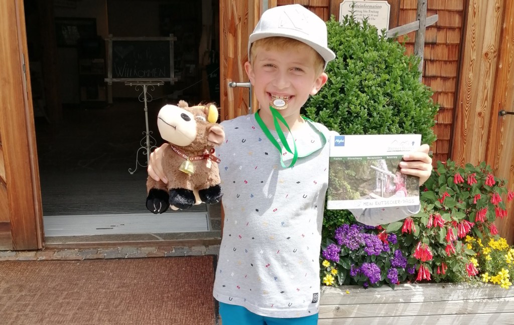 Am ersten Morgen wanderten wir zunächst nach Ofterschwang, um für unseren Outdoorjungen den Entdeckerpass der Hörneredörfer zu holen. Dieser begleitete uns die nächsten zwei Wochen zu allerhand Wanderungen, ließ uns Stempel einsammeln, Aufgaben lösen, Fragen beantworten und bunte Bilder malen. Damit konnten wir Punkte sammeln und am Ende des Urlaubs je nach Punktestand eine Bronze-, Silber- oder Goldmedaille erhalten. Habt ihr schon eine Idee, was es geworden ist? Weiter unten verrate ich es euch.