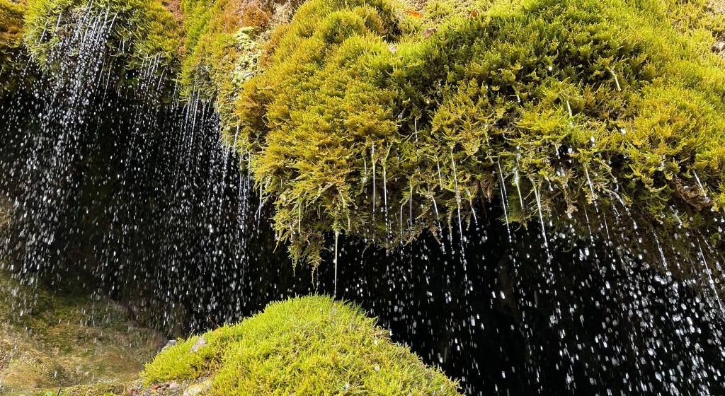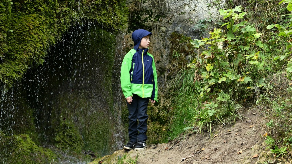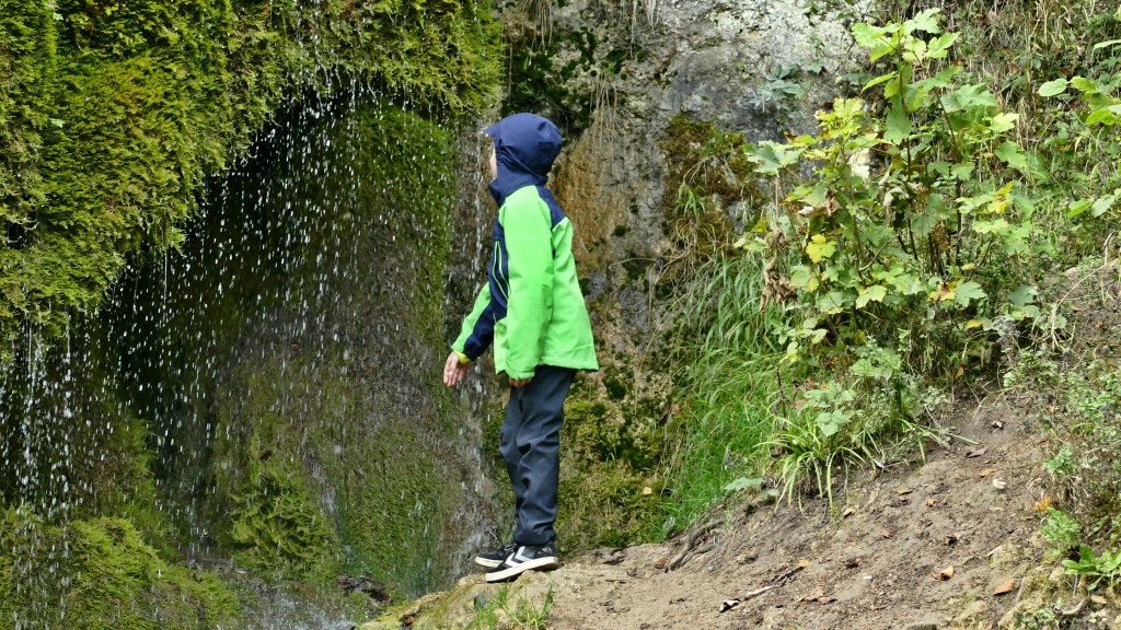 Das Besondere und Wunderschöne am Wasserfall Dreimühlen ist jedoch nicht seine Höhe, sondern die grün bewachsene Kuppe der Geländekante, an dem das Wasser hinabfällt. Fasst wirkt es wie ein flüssiger Vorhang vor den unterschiedlichen Grüntönen des Mooses, das hier am Fels wächst. Bei unserem Besuch kamen bedingt durch den Herbst noch ein paar zusätzliche Farbnuancen hinzu. Toll soll aber auch ein Besuch im Winter sein, wenn sich das Wasser in Eiszapfen verwandelt. Ich denke, der Wasserfall hat zu jeder Zeit seine ganz besonderen Reize. Unser Outdoorjunge hat das hinabfallende Wasser übrigens auch probiert und fand es ganz köstlich.