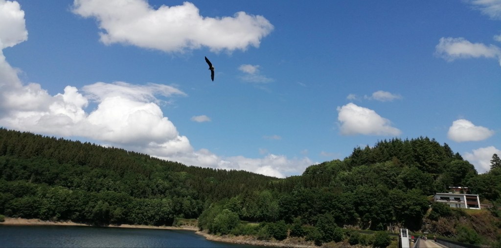 Am ersten Tag wanderten wir zur „Greifvogelstation & Wildfreigehege Hellenthal“. Über schön angelegte Wanderwege erreicht man darin die Gehege einheimischer Wildtiere sowie Kinderzoo und einen großen Spielplatz mit vielen Picknickmöglichkeiten. Wer die Tiere füttern mag, kann passendes Futter für kleines Geld erwerben. Das Highlight des Parks ist die Greifvogelstation, in der mehrmals pro Tag Flugshows vorgeführt werden. Bei unserem Rundweg kamen wir an Streuobstwiesen vorbei und konnten immer wieder schöne Blicke auf die Oleftalsperre erhaschen. So verbrachten wir mehrere Stunden in dem Wildfreigehege zwischen Tierbeobachtung, Picknick und wildem Spielen der Kinder auf dem Spielplatz. Bevor wir uns schließlich wieder auf den Rückweg zu unserer Unterkunft begaben, stärkten wir uns noch im Restaurant „Zum Adler“.