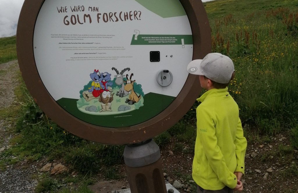 An unserem letzten Tag am Golm wanderten wir auf Golmis Forscherpfad. Dazu gondelten wir zunächst noch einmal zur Bergstation. Dort oben angekommen ging es dann auch direkt los: Über eine Wegstrecke von 3,5 Kilometer zurück zum Haus Matschwitz gab es ganze 21 Erlebnis-Stationen zu entdecken. Unser Outdoorjunge, und auch wir, waren begeistert: Drehen, Ziehen, Schieben, Drücken – er war bei allem voller Elan dabei. Ganz besonders gut gefiel ihm der Wasserspielplatz, die Buddelstation (bei der er tatsächlich Edelsteine gefunden hat) und die Holzkugelbahn ganz am Ende.
