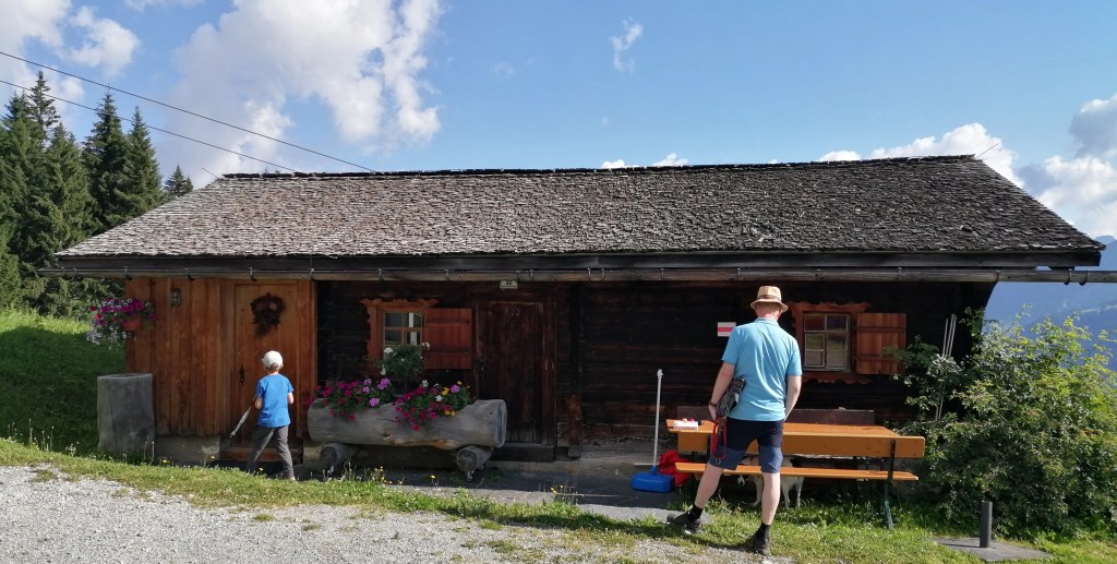 Nun war es also soweit: Wir parkten unser Auto am Wanderparkplatz Latschau und fuhren mit unserem Gepäck in der Golmerbahn bis zum Haus Matschwitz. Die Gondel brachte uns schnell hinauf und auch Panda (unsere Hündin) verlor schnell die Scheu vor dem für sie ungewohnten Transportmittel. Im Haus Matschwitz bekamen wir den Schlüssel für unsere Hütte, dem Maisäss Matschwitz. Es war Liebe auf den ersten Blick! Die urige Hütte mit zwei Schlafzimmern und einem modernen, kleinen Bad war einfach perfekt für uns. Dazu ein paar Sitzgelegenheiten und Liegestühle vor der Hütte, natürlich mit bester Aussicht auf die Berge auf der anderen Seite des Tals. Unsere Hütte hatte auch eine kleine Küchenzeile mit Wohnraum, wir haben uns aber den Luxus gegönnt, im benachbarten Haus Matschwitz zu frühstücken und zu Abend zu essen. Das Essen dort können wir auch sehr empfehlen! Ab der zweiten Nacht waren dort wir übrigens die einzigen Nächtigungsgäste. Dadurch wurde nicht nur exklusiv nur für uns Essen gemacht, wir konnten abends und morgens die Ruhe am Berg auch ganz besonders genießen. Einfach traumhaft!