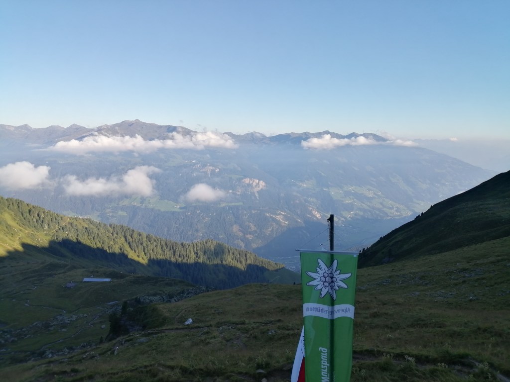 Am nächsten Tag liefen wir von Schwendau aus ganz gemütlich bis zur Talstation der Ahornbahn, die uns hinauf auf knapp 2.000 Meter Höhe brachte. Leider hüllte sich oben alles in dicke Wolken, sodass wir nur ein paar Meter weit schauen konnten. Trotzdem machten wir uns gut gelaunt auf den Weg zur Edelhütte, die uns als Stützpunkt für die nächsten zwei Tage dienen sollte. Leider änderte sich am Wetter nichts, wir konnten die Umgebung mehr erahnen, als sie wirklich zu sehen.