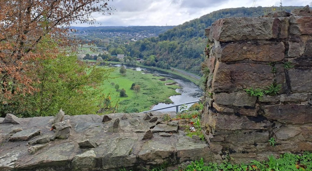 Am S-Bahnhof Essen-Kupferdreh startete am nächsten Morgen unsere zweite Etappe standesgemäß: Die ersten Meter führten uns direkt am Deilbach entlang. Danach warteten bereits die ersten Höhenmeter auf uns: Bis wir Niederbonsfeld erreichten, wanderten wir wie schon so oft am Vortag immer wieder Auf und Ab sowie durch schöne Wälder und über spannende Abenteuerpfade. Auch in Niederbonsfeld angekommen, ging es zunächst wieder steil bergauf, bis wir uns allmählich dem vielleicht schönsten Highlight auf dem Deilbachsteig näherten, der Ruine Isenberg mit herrlichem Blick auf die Ruhr.