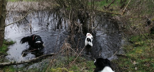 Nach Überschreiten der Halde geht es gemütlich bergab bis zu ein paar Tümpeln, die besonders bei Hunden an warmen Sommertagen zur Abkühlung beliebt sind. Unsere Hunde sind auch an einem grauen Märztag begeistert darin herumgetollt.