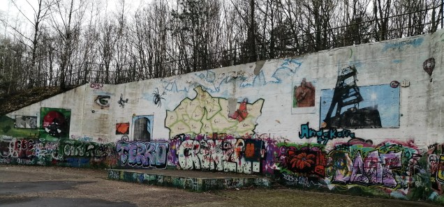 Weiter wandern wir mit einem großen Schwenk nach links und dabei kaum noch spürbar bergab, bis wir wieder ganz unten angekommen sind. Hier empfängt uns eine bunte Graffiti-Wand sowie eine Picknickmöglichkeit. So bleibt ausreichend Zeit zum Anschauen der Kunstwerke, während die hungrigen Mägen gefüllt werden.