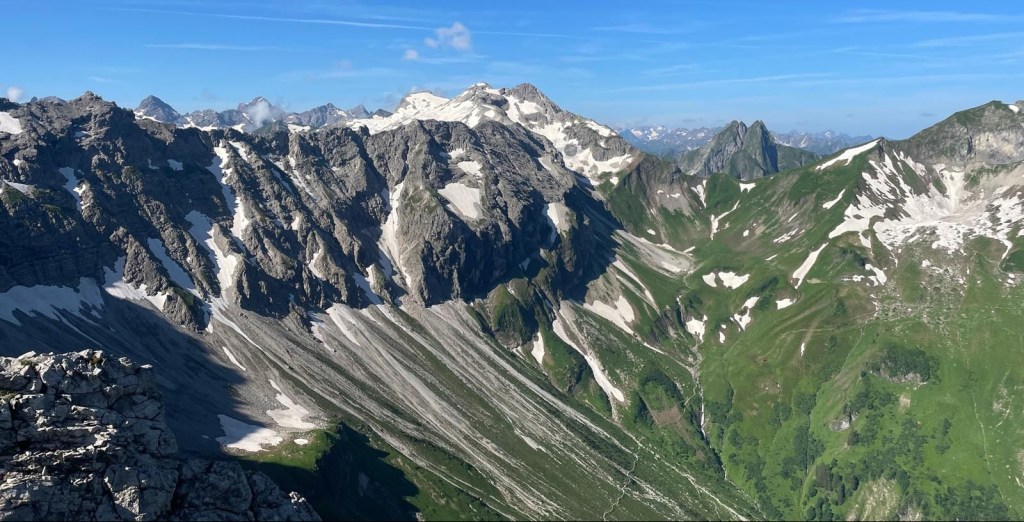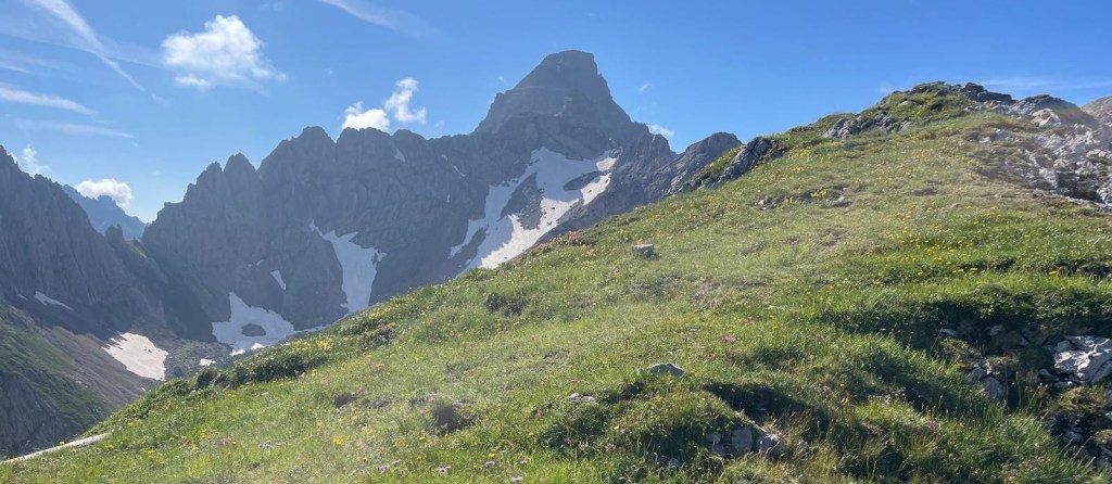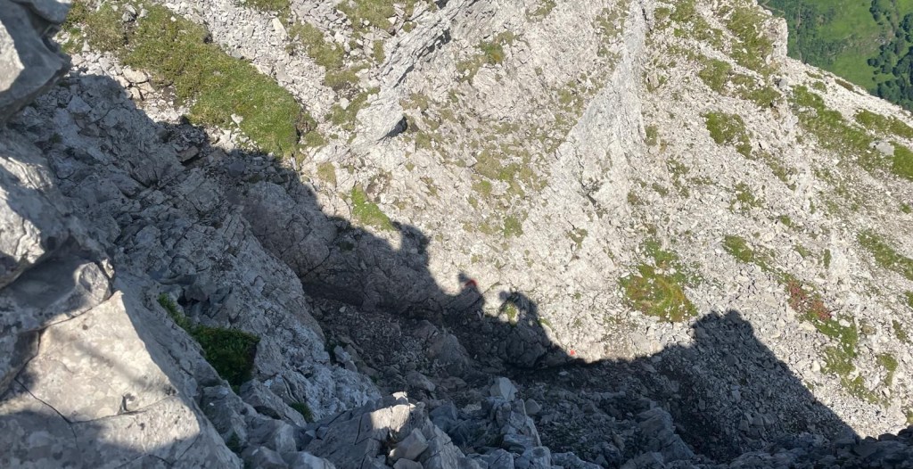Der leichte Klettersteig im Anschluss stellte uns vor keine größeren Probleme und ich stellte mal wieder fest, dass ich im Sommer einfach lieber im Fels statt im Schnee unterwegs bin. Kurz darauf erblickten wir den Schlussanstieg zum Hochvogel und diesem Moment sagten mein Kopf und mein Bauch einfach „stopp“. Es sah wahnsinnig steil und zudem extrem rutschig mit gerölligem Untergrund aus. Ich hatte mir vorher vorgenommen, nicht weiter zu gehen, wie es sich gut anfühlte – und das war dann wohl besagter Moment. Daher ließ ich die anderen beiden (wir waren an dem Tag nur zu Dritt unterwegs) alleine weiterziehen und suchte mir einen großen Stein, um sie bei ihrem Gipfelsturm zu beobachten.