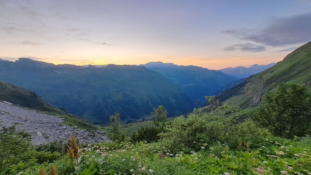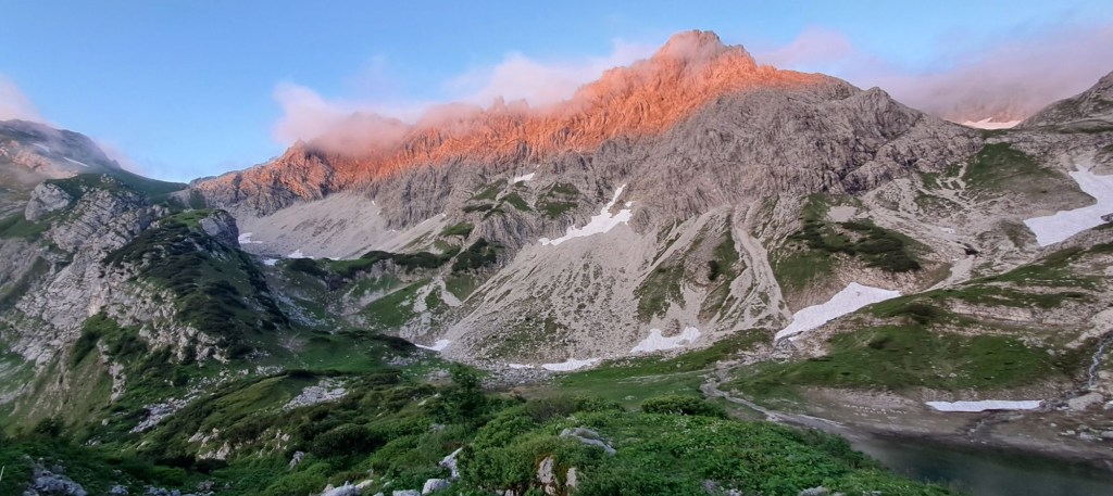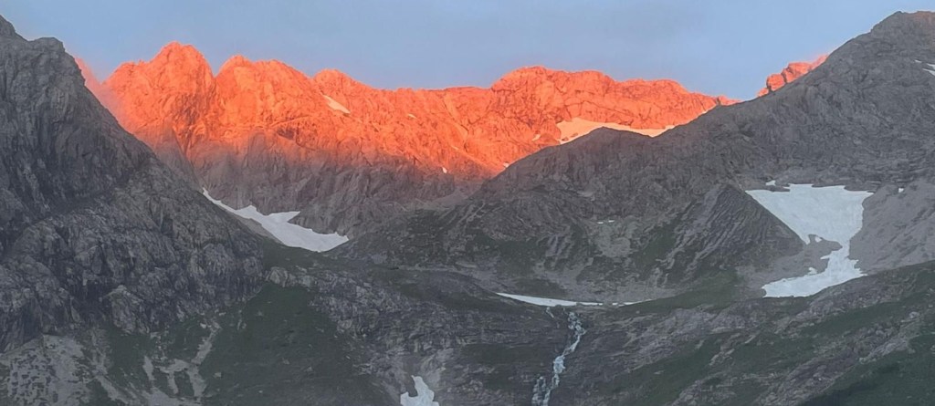 Am späten Abend erwartete uns dann noch ein besonderes Highlight: Plötzlich rissen die Wolken auf und wir bekamen ein traumhaftes Alpenglühen zu sehen. Ein absolut wunderbarer Moment und definitiv einer der Gründe, warum wir auf die Berge steigen.