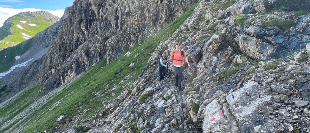 Nachdem wir die Aussicht genossen und zahlreiche Fotos geschossen hatten, machten wir uns an den mehr als 1.000 Höhenmeter langen Abstieg zum Giebelhaus. Nach den Kletterpassagen erreichten wir wieder den Höhenweg ins Gries – Genusswandern pur.