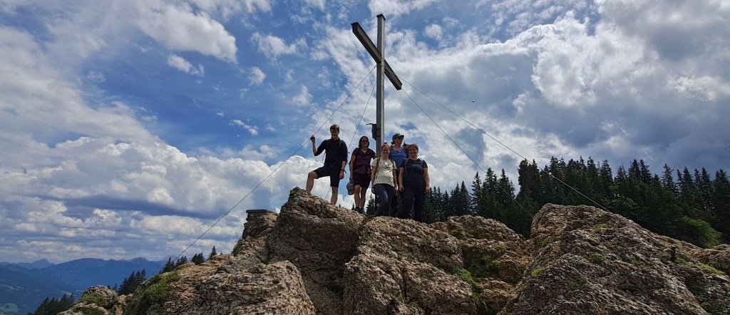 Im Nachhinein betrachtet hätte ich den Gipfel des Hochvogel wahrscheinlich locker geschafft. Aber ich denke, nach der großen Überwindung, das Schneefeld zu überqueren, war es für mich an dem Tag einfach „genug“. Einen Gipfelerfolg konnte ich trotzdem noch verbuchen: Zunächst stieg ich mit meiner zufälligen Bergbekanntschaft Marit (sie hatte ebenfalls auf den Schlussanstieg zum Hochvogel verzichtet) auf die Kreuzspitze, etwas später mit Dani und Christoph nach ihrem Gipfelerfolg am Hochvogel ein zweites Mal.