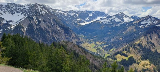 Unsere dritte Wanderung in diesem Urlaub sollte uns auf einen für uns bisher unbekannten Gipfel führen, das Imberger Horn. Die Tour startete an der Bergstation der Hörnerbahn, oberhalb von Bad Hindelang. Zunächst liefen wir über den Erlebnispfad Georgs Naturwelt, bis der Weg in Richtung Gipfel abzweigte. Nun wurde es deutlich steiler und anspruchsvoller: Wir mussten ein Altschneefeld queren, über Wurzeln und kurz vor dem höchsten Punkt auch ein wenig durch Felsen klettern. Ein Weg, genau nach unserem Geschmack!